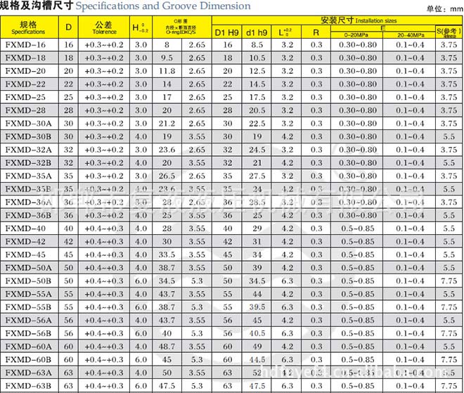 由高耐磨聚四氟乙烯合金復合材料矩形圈和O形橡膠密封圈組成。O形圈提供足夠的密封力,對矩形圈的磨耗起補償作用。與導向支撐環配套使用,缸徑小于∮40的規格應采用分體溝槽。